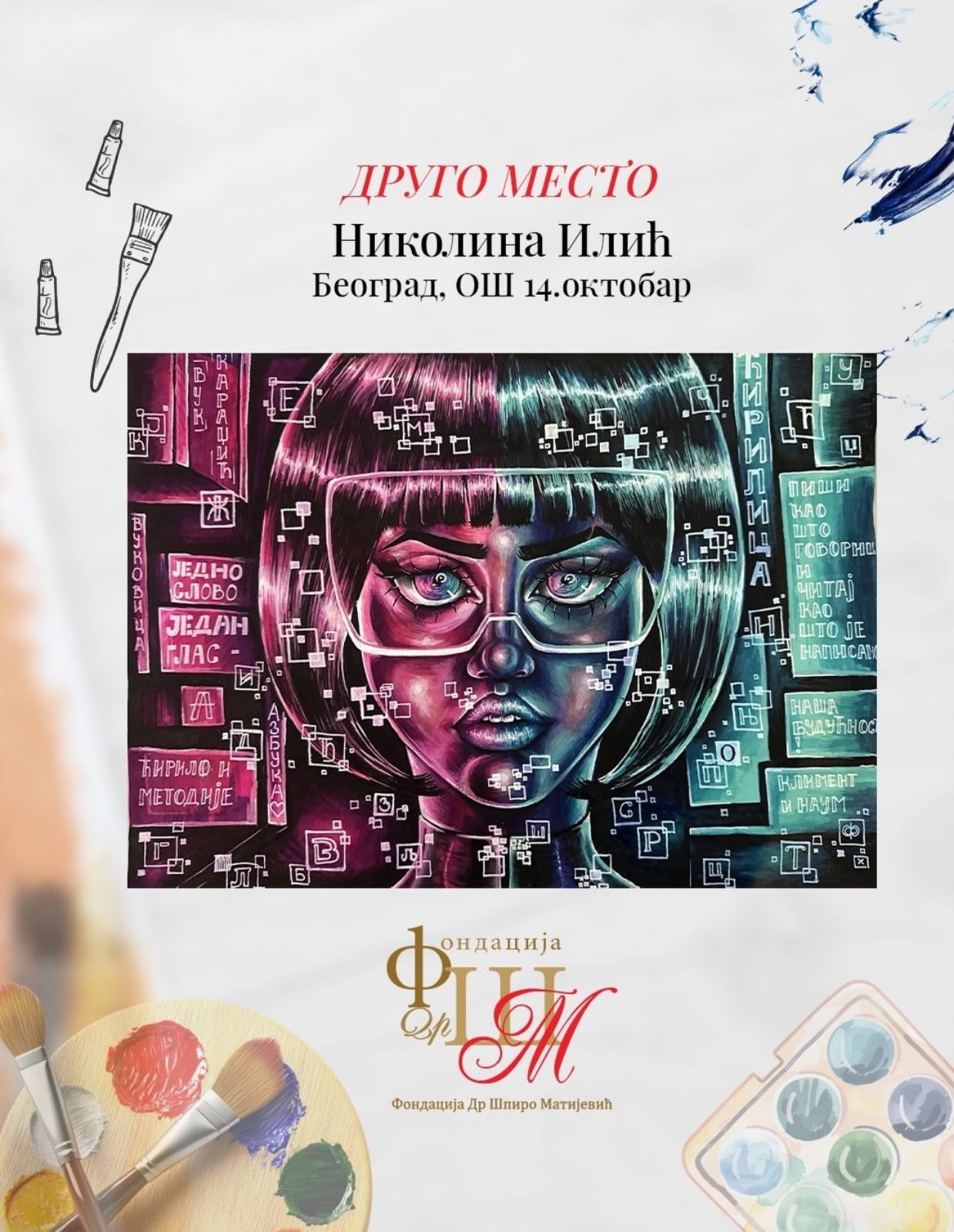 На првом ликовном конкурсу Фондације „Др Шпиро Матијевић“, са темом „Ћирилица – моје писмо, моје наслеђе“, наша Николина Илић 8-1 је освојила другу награду у категорији узраста 14 до 15 година.