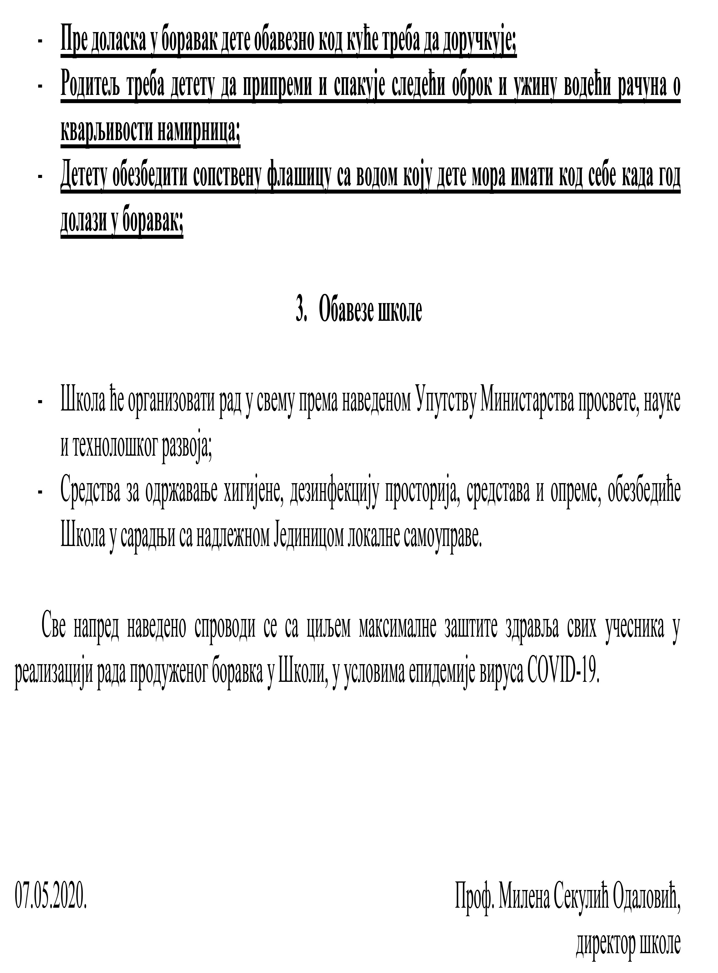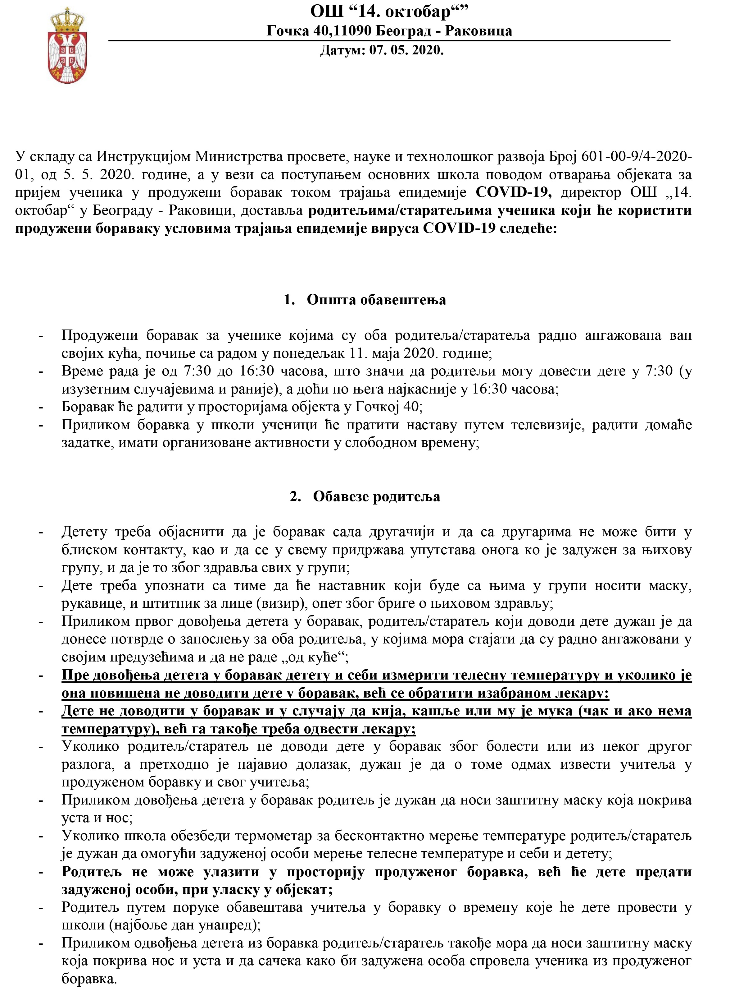 Обавештење родитељима деце из продуженог боравка, у време проглашене епидемије
