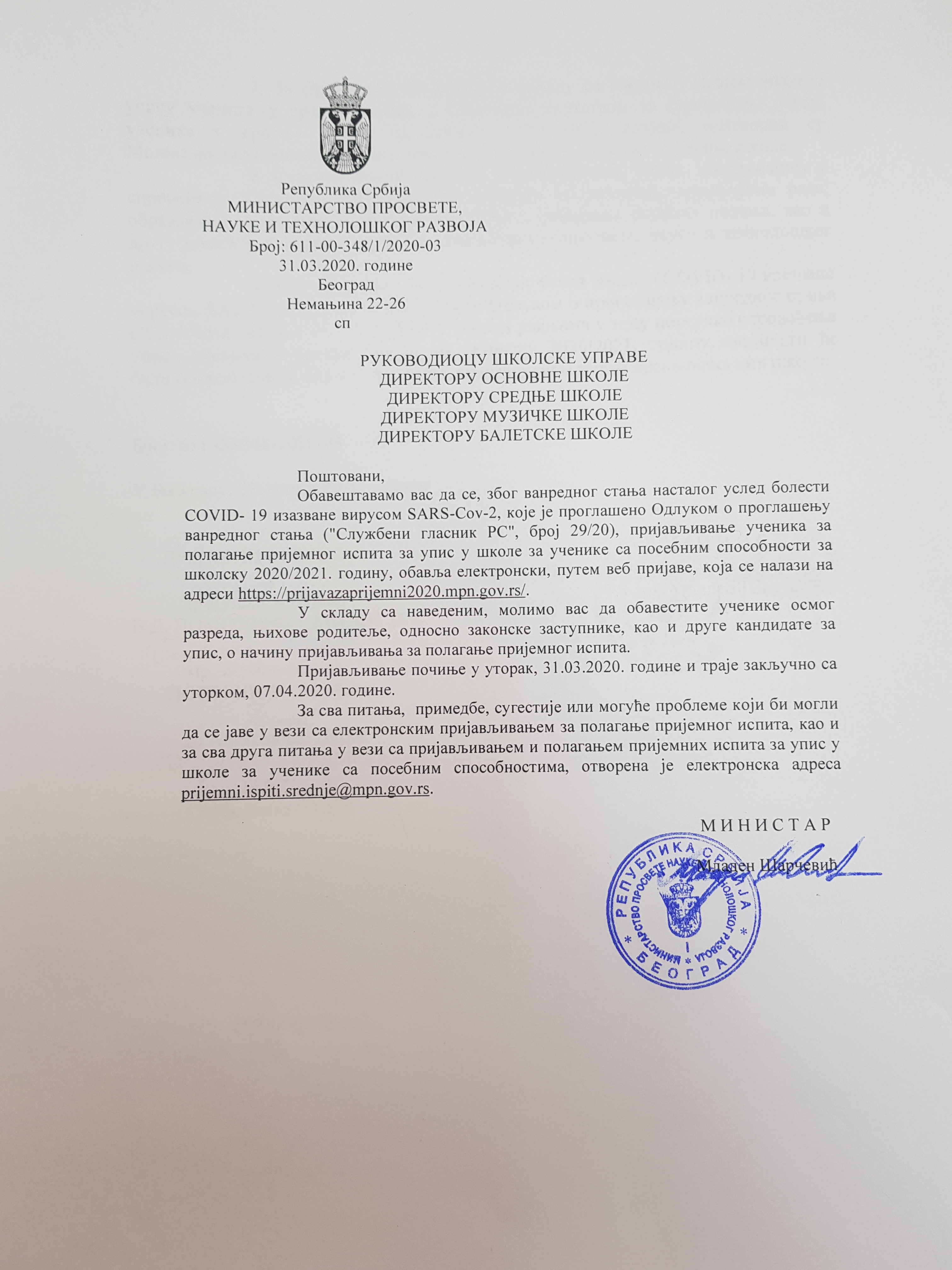 Пријава за пријемни испит ученика са посебним способностима